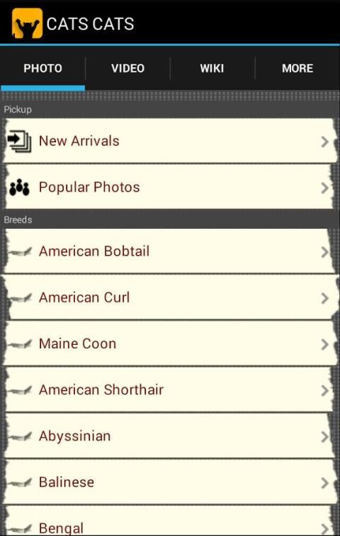 Приложение включает в себя много пород, таких как американский бобтейл, мейн-кун, кошка Британская короткошерстная кошка, абиссинская кошка, балийский, Бенгалии, корниш-рекса, Египетская мау, гималайские, о-ва Мэн, Манчкин, персидском, русская голубая, сиамская, сибирская и т.д.
