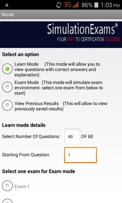 Complete explanation is provided for each question in Learn mode, and actual exam environment is simulated in Exam mode. Options to save the results and reviewing questions are provided.