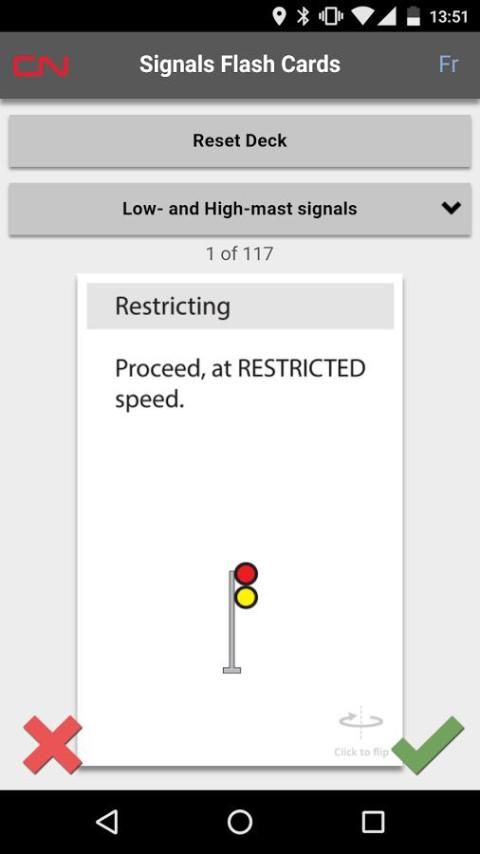 Обучающее приложение для сотрудников CN изучить CROR блок и блокирующие сигналы с помощью флэш-карты. Одна сторона представленной карты является сигнал изображения, пользователь может затем "щелчок", чтобы перевернуть карту над раскрыть имя амплитуду сигнала и индикации.