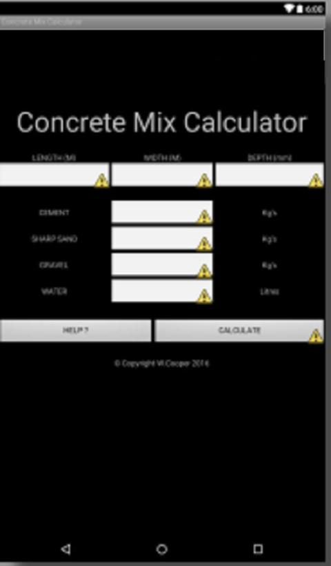 CONCRETE MIX CALCULATOR. This App is a must have for any DIY enthusiast. Accurately calculate the amount of Cement, Gravel, Sharp Sand and Water required for a perfect Concrete mix for Most DIY jobs. Helps ensure you order the correct amount, to minimise waste. Simply Enter the Area Dimensions to be covered, And required depth, and press Calculate. Amount of required materials will be shown in Kilo's. Mixture is Based on : 1 Part Cement 2 Parts Sand 4 Parts Gravel. And is Suitable for Most Garden jobs and Shallow foundations for Sheds etc. NOT SUITABLE FOR BUILDING FOUNDATIONS. Please rate this App if you like it. If you have an idea for an App you would like to see available on android market, then please contact us. KEYWORDS : Concrete, Cement, Ground Work, Foundations, Building, Ballast, Garden, Shed, Aggregates, Gravel, Sand, Mixing.