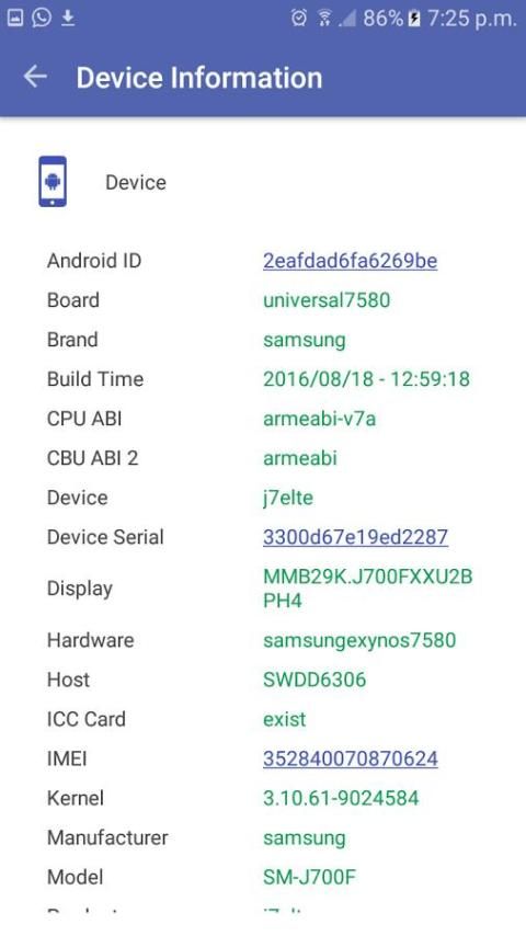 - Прибор: название модели, смартфон Производитель, набор микросхем CPU, номер сборки и версии Android OS.