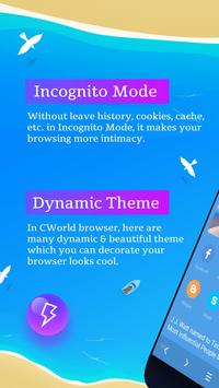 CWorld Browser providing you to block annoying ads, lots of useful features, including Incognito Mode, Speed Mode, Full Screen Mode, etc.