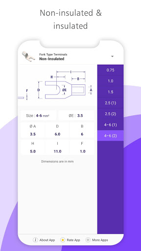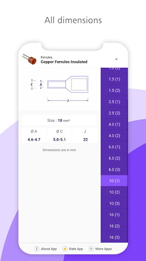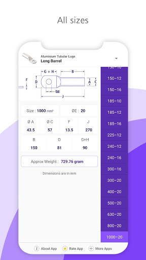 Приложение для стандартных медных и алюминиевых кабельных наконечников и разъемов со всеми размерами, размерами и весом.