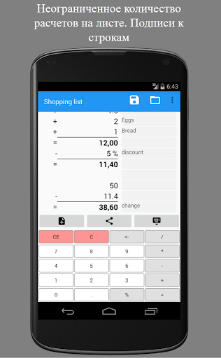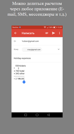 -можно делиться расчетом через любое текстовое приложение на смартфоне (почта, месенджеры и т.д.)