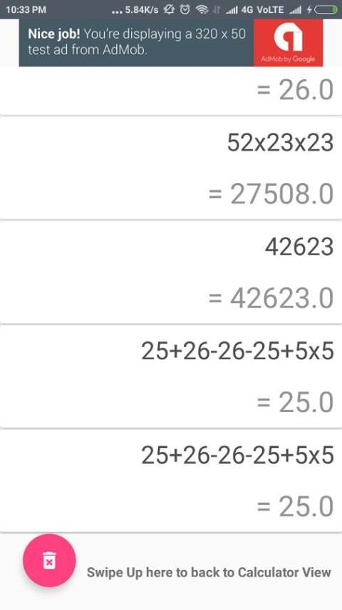• Проведите пальцем вниз по экрану, чтобы просмотреть историю. Проведите пальцем вверх / ударил кнопку назад, чтобы вернуться к виду калькулятор.