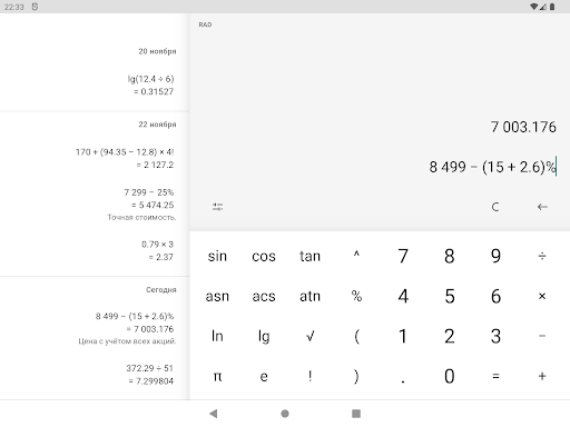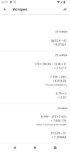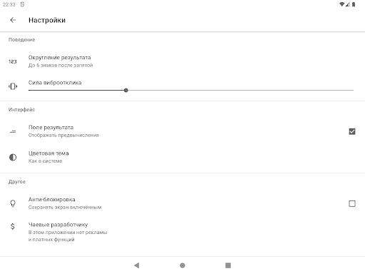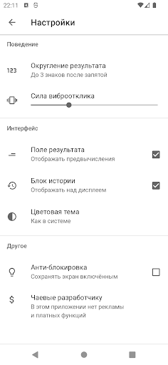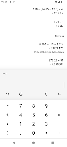 Калькулятор с процентами, степенями и функциями. История вычислений с комментариями. Курсор для редактирования в любом месте. Простой интерфейс с тёмной и светлой темой.