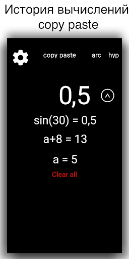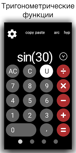 В зависимости от состояния переключателя Deg(градусы)/Rad(радианы), аргументы тригонометрических функций (sin, cos, tg, ctg, sec, csec) и результаты обратных тригонометрических функций (asin, acos, atg, actg, asec, acsec) приводятся в градусах или радианах соответственно.