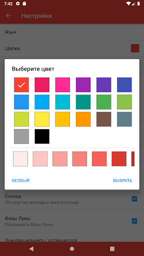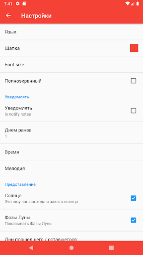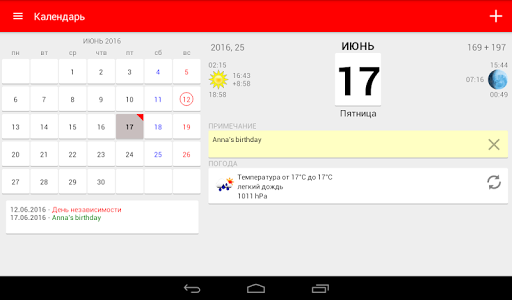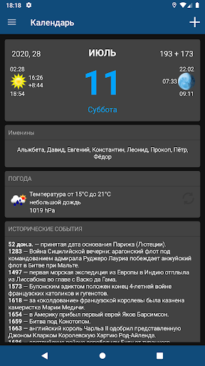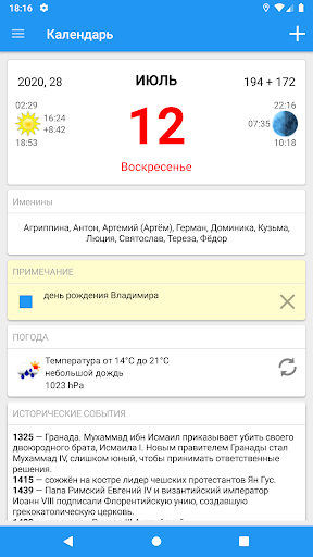 Календарь виджет показывает текущий день, время восхода и заката, фазы Луны и ее восток и запад, знак зодиака, Google Calendar событий и исторических событий.