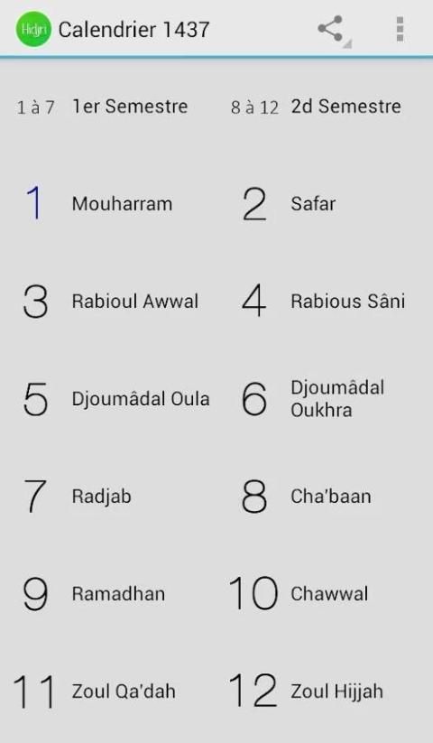 मुहर्रम, सफ़र Rabiul अव्वल, Rabious-शनि, Djoumâdal OULA Djoumâdal Oukhra, रज्जब, Cha'baan, Ramadhan, Shawwal, Zul Qa'dah, Zul Hijjah.