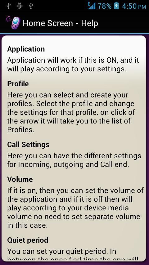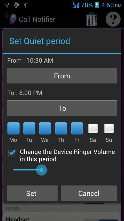 • Вы можете установить период затишья, когда приложение остается неактивным, и в этот период можно изменить громкость звонка телефона, как если ваши тайминги офиса являются 9 утра до 5 вечера, то в этом интервале применения будет оставаться спокойным и автоматически устанавливается свой желательно громкости звонка и как вы выходите из этого периода он будет автоматически установлен оригинальный громкости звонка, так что вы не пропустите ни одного звонка