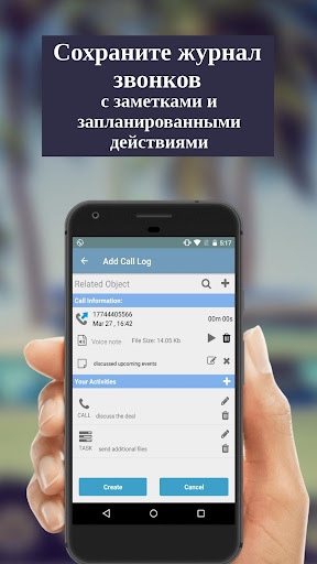 - Приложение предоставляет вам возможность создать запланированные действия в вашей CRM и установить напоминания о них;
