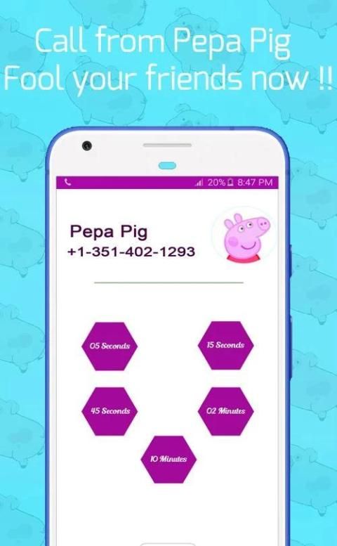 Это Пепа свинья фальшивый вызов Тренажер дает возможность установить время, когда вы тусклый получить фальшивый звонок от Свинка Пеппа и поговорить с виртуальной свинью на телефонный звонок, выбрав длительность из списка времени в интерфейсе вызова шалость ребенка свинок и ждать момент, чтобы получить фальшивый звонок от Пеппа ребенок свинья.