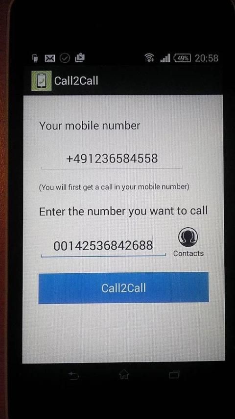 Сначала вы должны указать свой номер мобильного телефона, а затем номер, который вы хотите, чтобы call.you можно ввести номер, где вы хотите, чтобы вызвать вручную или вы можете напрямую скачать его от вас контактов. После этого вы впервые получили вызов в вашем мобильном телефоне, когда вы получаете звонок, Вы будете соединены с номером назначения.