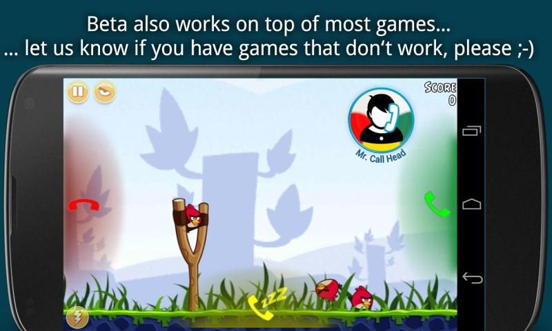 Мы считаем, что мы можем улучшить принципиально телефонные звонки на смартфонах. Когда-либо прерывание от приложения посредством вызова? CallHeads (бета) даст вам больше контроля о том, что делать с телефонного звонка, когда вы одновременно используя приложение. Вместо полноэкранном уведомления выскакивают и прерывая ваше приложение, вы увидите пузырь в виде наложения на вашем приложении, и вы можете продолжать использовать приложение. Например, если вы сейчас читаете текст, вы сначала не закончить текущий пункт до тех пор, пикап вызов, если вы играете в Angry Birds, вы можете сначала закончить рогатки, а затем ответить на телефон.