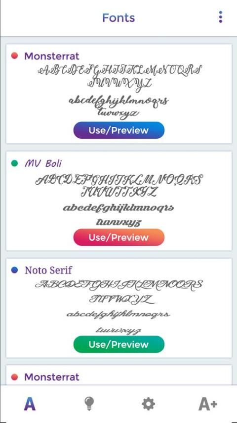 Каллиграфические шрифты бесплатно Стиль шрифта является уникальным менеджер шрифтов для андроид устройств. Каллиграфические шрифты бесплатно Начертание количество стильных шрифтов, смешные, прохладном, милый, Каллиграфические шрифты бесплатно и т.д .. Каллиграфические шрифты бесплатно Начертание простой в использовании, предварительный просмотр шрифтов деталей , а также загружать и использовать его, то все системные шрифты будут изменены.