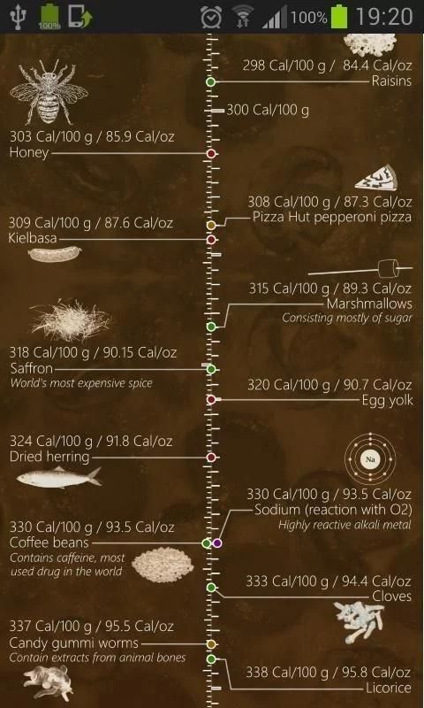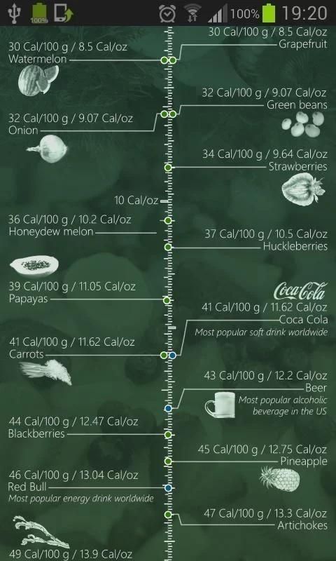 - Быстро и интересный способ узнать о калорийности содержания различных пищевых продуктов, напитков и топлива, и как они на самом деле сравнивать друг с другом