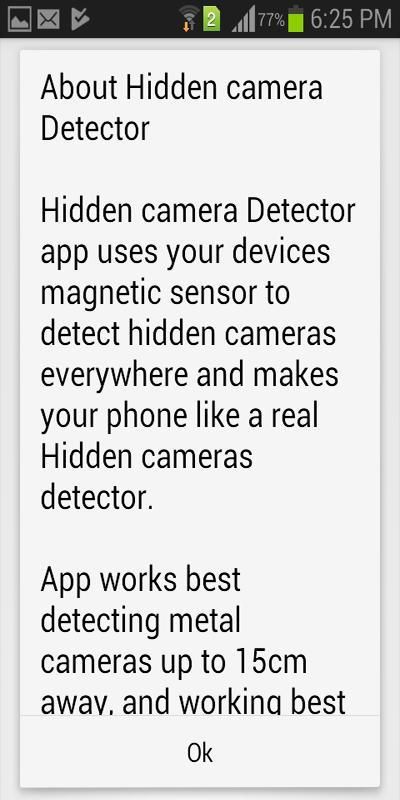Приложение детектора скрытой камеры использует ваши устройства магнитного датчик для обнаружения скрытых камер во всем мире и делает ваш телефон, как настоящие скрытые камеры, чтобы обнаружить.