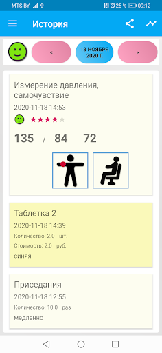 • Добавлять в журнал другие событий которые могут повлиять на эти параметры. Прием лекарств, еды, занятия спортом, пробежки, упражнения и др.