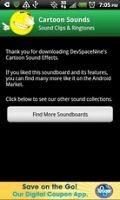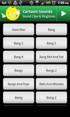 Cartoon Sound Effects! Dozens of sound effects that no cartoon can live without. Cartoon Sound Effects! Dozens of hilarious sound effects that no cartoon can live without. All kinds of boings, zips, skitters, whoops and whirls that accompany the greatest shows on television. Set any of the clips as a ringtone, notification, or alarm sound.