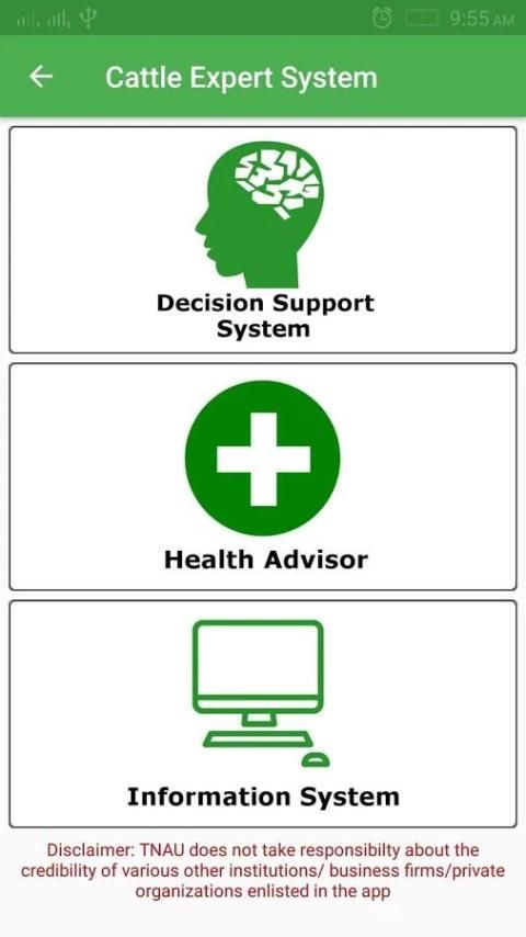 Экспертная система крупного рогатого скота TNAU является мобильное приложение, которое охватывает Feeding Management для крупного рогатого скота и буйволов, Разведение sManagement для крупного рогатого скота и буйволов, болезней и управления по контролю для крупного рогатого скота и Буффало, технологии производства для крупного рогатого скота и Буффало, управления теленок для крупного рогатого скота и Буффало, Уход и содержание Управление для крупного рогатого скота и буйволов, общей практики управления и для крупного рогатого скота и буйволов и Ферма Machineries для крупного рогатого скота и буйволов