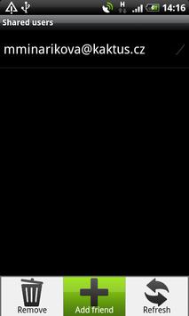 For location sharing there is an accounts list, where you must add the PoM ID of the person who wants to watch you (the other person must have a PhoneOnMap account). In this list you can see PoM IDs of all people who can see your position.