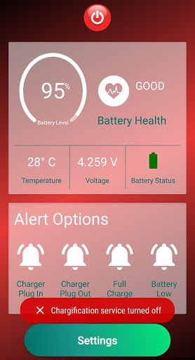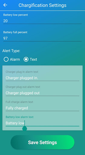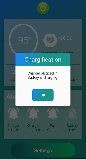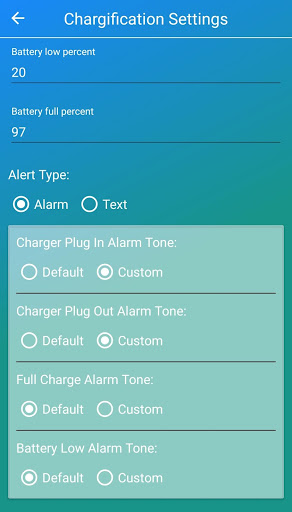 Chargification app will play app's built in musics when charger is plugged in, plugged out, battery gets fully charged and when battery is low. 4 types of music for 4 cases. User can also set custom music and text as desired. User can turn on or off Chargification alerts. The app will also play sound or say text when the screen is locked.