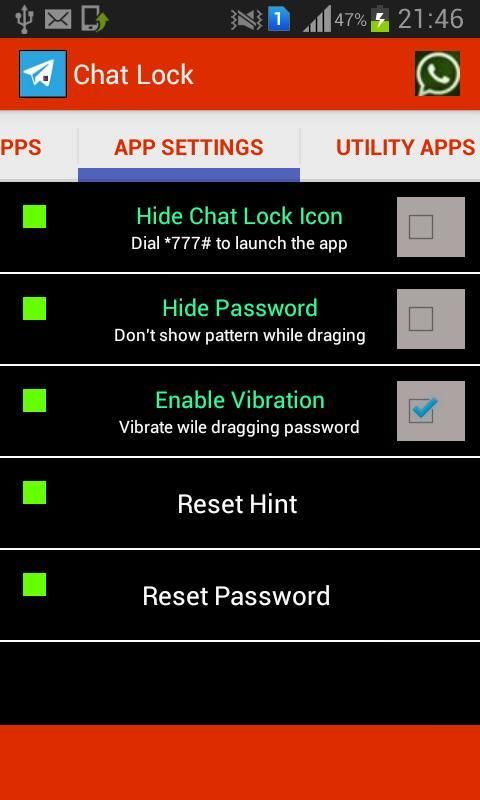 New Feature Updates: More Chat Apps Added * Group Me * KiK * Tango * Maaii * SnapChat * ChatOn * Hide Application Icon * New UI * New Chating apps added. * Hide Password from your near once. Performance Improvement *The Apps provide's feature to manage & Lock all the top Chating apps Ex-Whats App,FB Chat,BBM,Hike & many more... *It is the one of the best RAM & Memory optimized app which you find in the market. *Its version small apk file size(2 MB) with all advanced feature in it. *It is very easy to use UI representation to manage the app settings. So Enjoy this Amazing lighting fast app & protect your privacy from others ones .