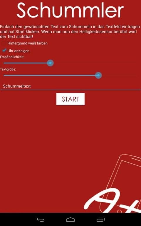 Just insert your text in the textbox and press start. If you touch the light sensor with your finger the text is displayed. Perfekt for cheating in school. The phone seems powerd off ( or shows a clock if you want) so no teacher will notice it.