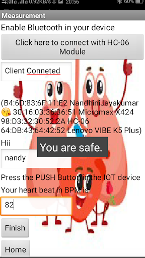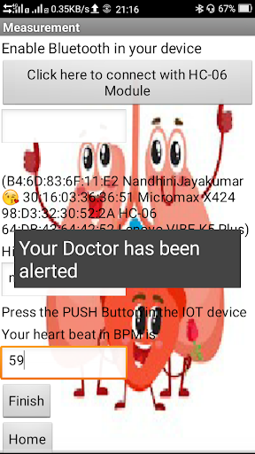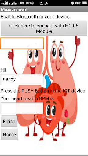 This app is used along with the IOT device for measuring the Heart Beat..It provides you with Login and Sign up facilities..By pressing the PUSH button in IOT device ,the Heart Beat is start monitored.It displays the Heart Beat measured from the IOT device..One of the major highlights of this application is that it sends alerts (SMS) to your doctors if your Heart Beat is abnormal and send SMS to you if your Heart Beat is normal..