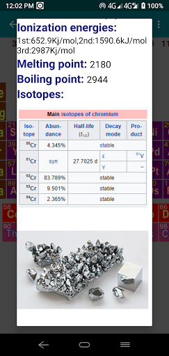химикат Элементы функции, такие как, энергия ионизации, группа и период и период химического элемента, кипячения и плавления химического элемента, электронная конфигурация химического элемента, изотопов и т. Д.