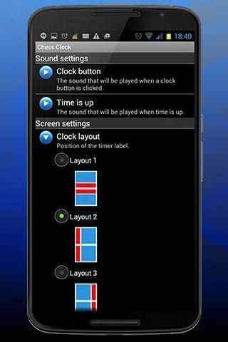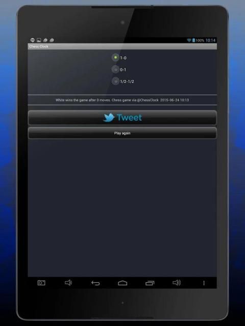 Это приложение позволяет вам использовать вашу вт Android устройство в качестве шахматных часов. С помощью этого приложения вы можете играть в игры Внезапная смерть или игры со временем прирост "Фишер". Это также позволяет Tweet результат игры и количество сделанных ходов, так, чтобы ваши друзья знают, насколько ты хорош.