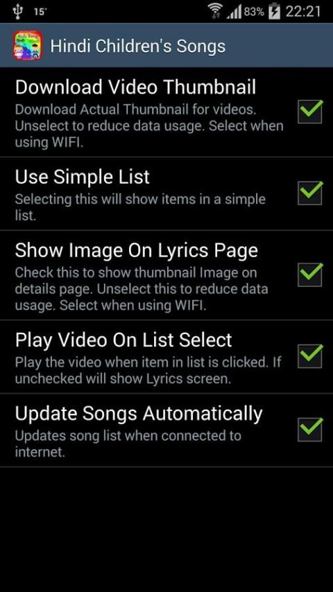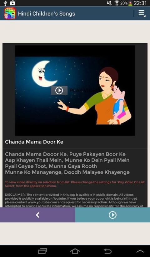 Приложение в настоящее время перечислены 50 + популярные Хинди Детские песни. Индейцы, живущие за границей, могут помочь своим детям научиться хинди и о индийской культуры - чтобы помочь им оставаться на связи со своими корнями, а также связи с их большой семьи.