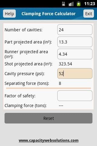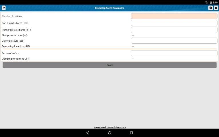 Усилие смыкания Calculator представляет собой инструмент для расчета прижимная сила в машины литья под давлением на основе как часть другой области в предполагаемый район, занявший второе место предполагаемый район, полости давление и количество полостей.