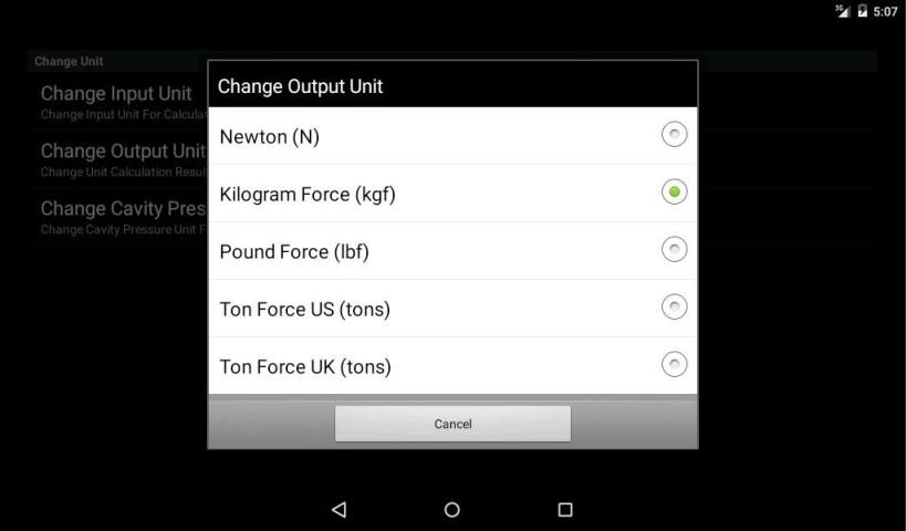 Now our app support Inch, Mili Meter, Centi Meter units for areas, cavity pressure and also for output force.