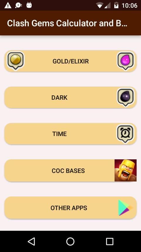 Вычислить Драгоценные камни, что вам нужно, чтобы купить золото, эликсир, темный эликсир. Иногда нам нужно, чтобы уменьшить время потребуется для завершения времени сборки ресурсов, так что вы можете рассчитать драгоценные камни, необходимые для сокращения времени тоже. Кроме того, вы можете создать сильную Clash клана базы для своих противников