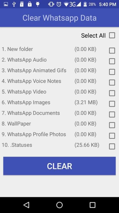 Пользователь может очистить данные WhatsApp мгновенно с этим конкретным приложением и получить свободное пространство. Для удаления WhatsApp пользователей данных просто нужно выбрать папки, такие как WhatsApp Аудио, анимированные GIF, голосовые заметки, изображения, фотографии профиля, статус, документы и т.д.