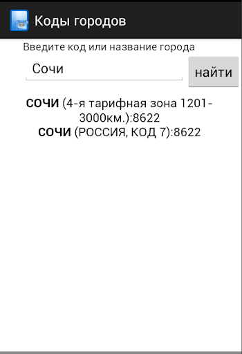 2) В поисковое окно программы введите название города и нажмите "найти", программа покажет телефонный код города.