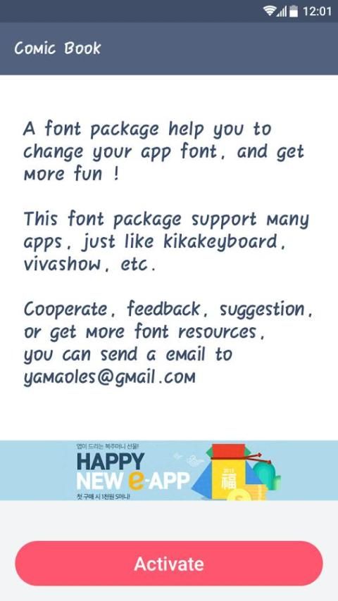 В качестве пакета шрифтов, Comic Book может дать вам более широкий выбор, и поможет изменить ваше приложение шрифт, так что вы можете получить больше удовольствия, когда вы используете приложение! Эта поддержка пакета шрифтов много приложений, так же, как kikakeyboard, vivashow и т.д.