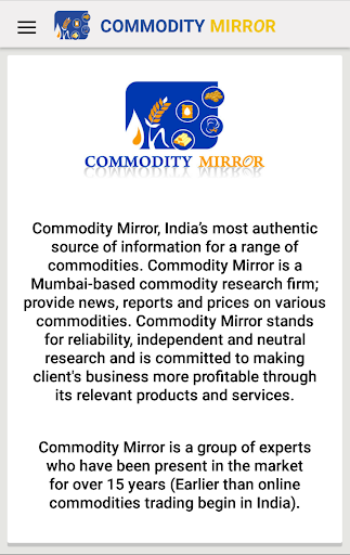 Commodity Mirror - это товарная научная фирма на основе Mumbai;Предоставлять новости, отчеты и цены на различные товары.Товарное зеркало означает надежность, независимое и нейтральное исследование и стремится сделать бизнес клиента более выгодно в соответствии со своими соответствующими продуктами и услугами.