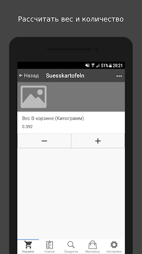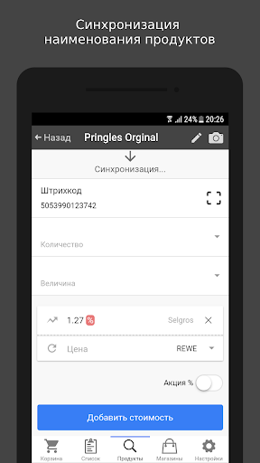 Вкладка "Корзина" предполагает использование приложения путем сканирования штрихкода товара непосредственно в магазине.
