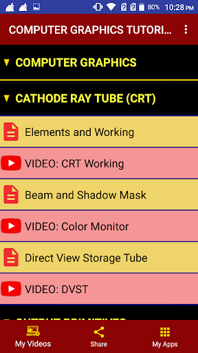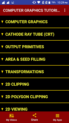 Это обучающее приложение охватывает большую часть основных темов компьютерной графики и мультимедиа. Содержание учебника в формате PDF. В этом руководстве описывается все данные темы с четкими диаграммами. Для экзаменационной точки зрения, это приложение очень полезно для всех студентов компьютерных наук, информационных технологий и компьютерных приложений.