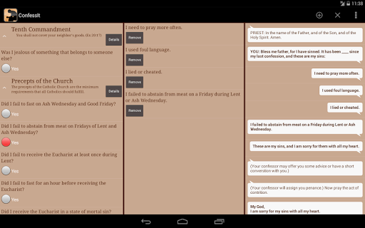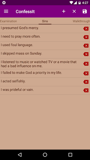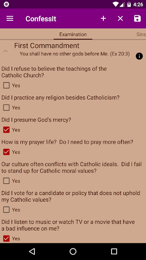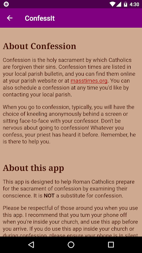 Confessit - это римско -католическое исследование приложения для совести для вашего устройства Android.Он предназначен для того, чтобы быть простым и простым в использовании, и поможет вам вспомнить ваши грехи для признания.Существует также пошаговое руководство, которое точно говорит вам, что скажет ваш исповедник и как вы должны ответить.Исследование совести основано на фундаментальных учениях католической церкви, легко понять и актуально для современных католиков.