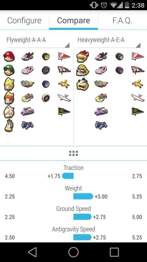 В Настройка Mk8, вы можете автоматически настроить комбинацию, установив значение важных атрибутов, таких как ускорение, скорость, и обработки. Вы также можете настроить конфигурацию, выбрав, какие именно части в использовании. После сохранения несколько комбинаций, вы можете сравнить их и увидеть компромиссы между ваших любимых комбинаций.