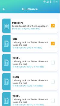 The app's also acts as student's personal guide or companion, helping the student understand steps that need to be taken and then guiding him/her to make the best decision at each step. Our guidance is not limited to test preparation. We take you from step 1 - how to get your passport made - all the way to finding housing at your university and then keep guiding you when you are in the new country.