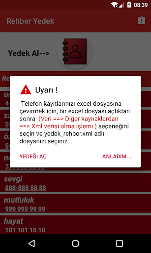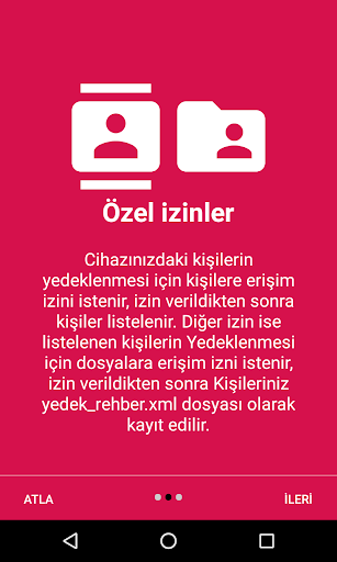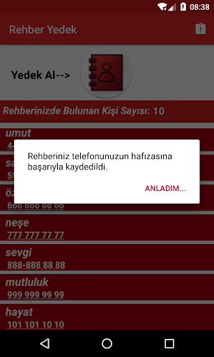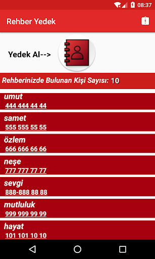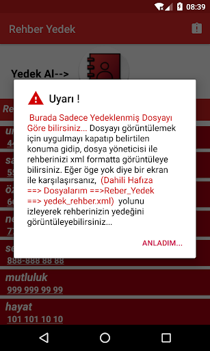 Вы будете отображаться на первом экране, когда вы даете необходимое разрешение на список вашего каталога.При нажатии на кнопку резервного копирования он создан на моих файлах файлов Contact_yedek, и VORE создается в папке VORE_REHBER.XLM, и ваши контакты зарегистрированы в этой папке.