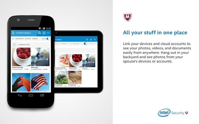 У вас есть фотографии, видео и документы о ваших смартфонов, планшетов и ПК, и на облачные сервисы, как Facebook и Dropbox? Это громоздко, чтобы вы помнили, где ваши файлы и помните, учетные данные для всех приводов для доступа к этим файлам? Если да, то у нас есть идеальное файлы агрегатор решение для Вас. С McAfee Personal Content Manager вы можете увидеть и управлять своими фотографиями, видео и документы в одном месте, с помощью одного простого приложения. Просто связать свои устройства