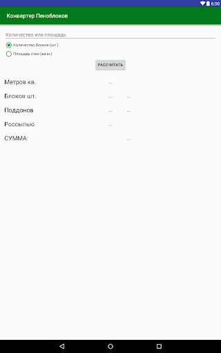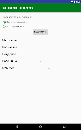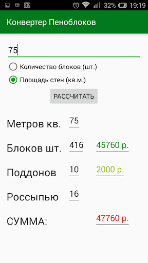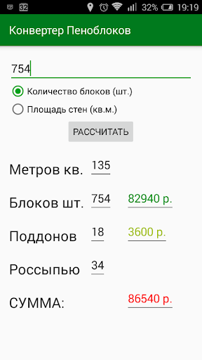 Приложение переводит площадь возводимых стен в количество производимых нами, необходимых для строительства, стандартных пеноблоков (200х300х600мм) и наоборот. Рассчитывается стоимость блоков. Цена одного пеноблока зависит от количества (оптовая скидка). Также рассчитывается залоговая стоимость поддонов и количество мест для доставки.