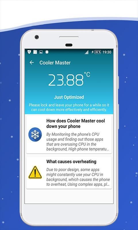 Не беспокойтесь о скорости вашего устройства и производительности при многозадачности и опыт в реальное время оптимизированной производительности. Лучший кулер остывания температуры телефона, помогает обнаружить температуру и контролировать дополнительное использование приложения, которое производит тепло и делает ваш телефон медленно. Cooler Master закрыть тяжелые ресурсы, чтобы уменьшить нагрузку на процессор и ниже температуры. Улучшить общую производительность вашего устройства охлаждения андроида остыть телефон и сохранить оптимальную производительность устройства с кулером ведущего приложения для охлаждения телефона.