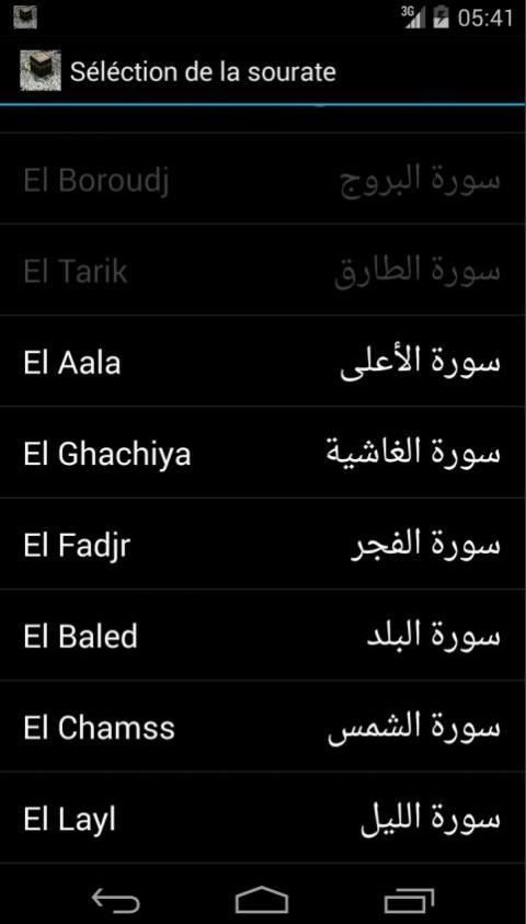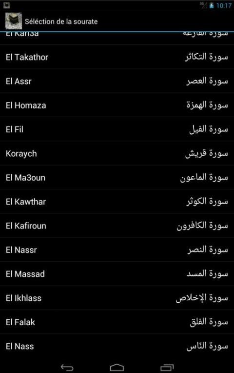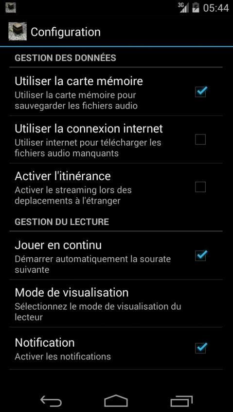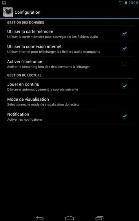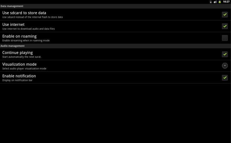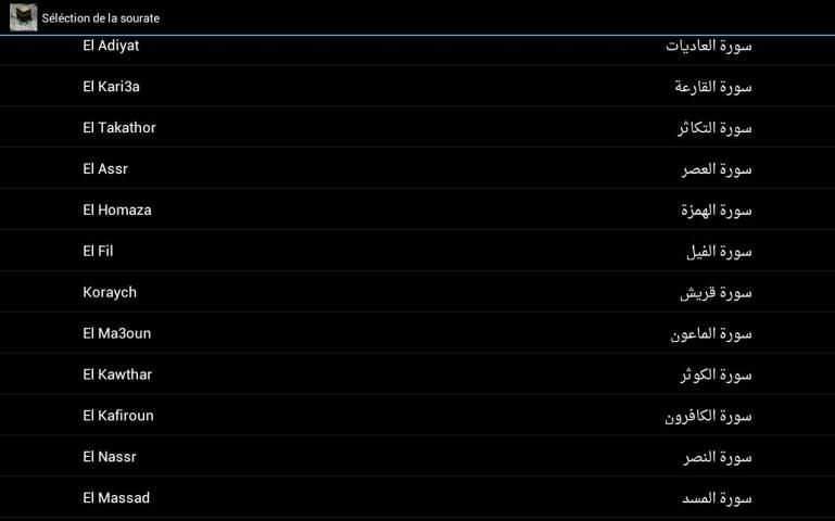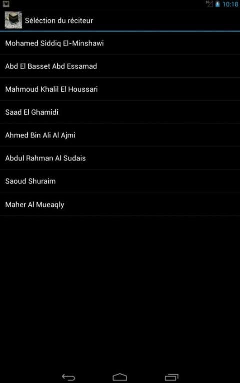Приложение содержит несколько предварительно установленной аудио файлов (один или два Хизб Наибольшие чтецов) Если у вас есть доступ в Интернет, вы можете выбрать для прослушивания потоковой передачи и загрузки дополнительных sourats.