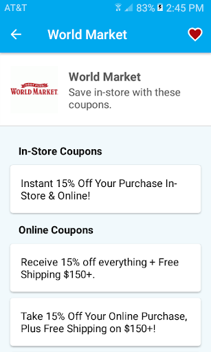 Simply find the retailer you're shopping at in the ever-expanding in-store section. When you locate the coupon you want to use, show the cashier and they'll scan in the savings directly from your phone. No printing necessary. The mobile coupons are updated daily so you always have access to the latest discounts and special offers as soon as they're available. If you like to shop from your mobile device, the app also offers an online section filled with valuable coupon codes. If you're looking to save at local restaurants, stores or services, check out the Nearby section to discover local savings nearest you.